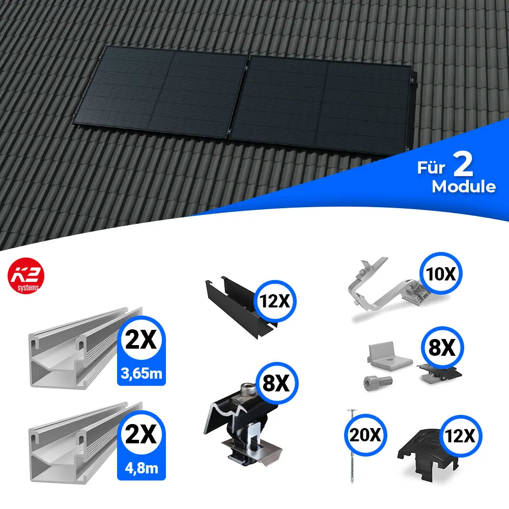 Mit robusten Dachhaken, widerstandsfähigen Aluminiumprofilen und schwarzen Modulklemmen sorgt das Set für eine stabile Befestigung mit ansprechender Optik. Geeignet für Schrägdächer mit Ziegel- oder Pfanneneindeckung, bietet es eine schnelle, sichere und unkomplizierte Montage deiner Photovoltaikanlage.