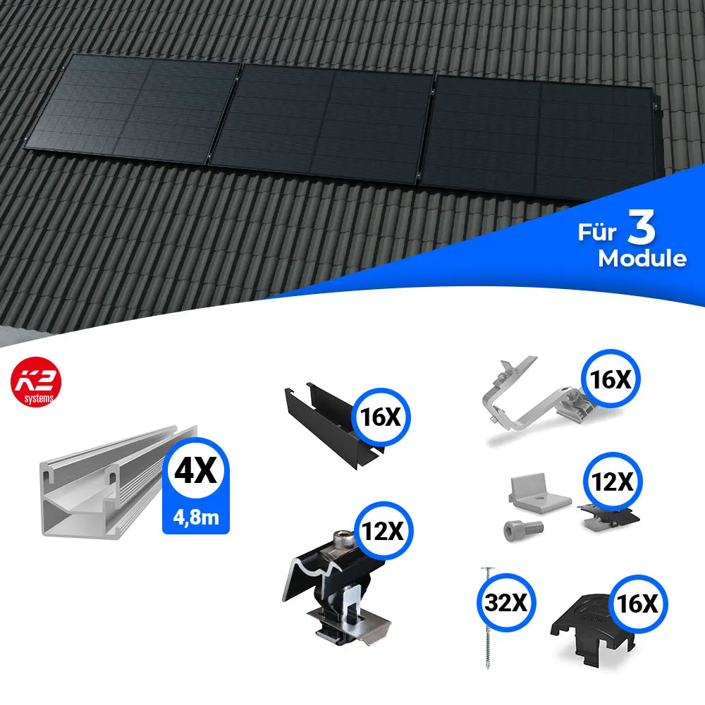 Ausgestattet mit stabilen Dachhaken, langlebigen Aluminiumprofilen und schwarzen Modulklemmen sorgt das Set für eine robuste und optisch ansprechende Befestigung. Geeignet für Schrägdächer mit Ziegel- oder Pfanneneindeckung, erlaubt es eine schnelle, sichere und effiziente Montage deiner Photovoltaikanlage.